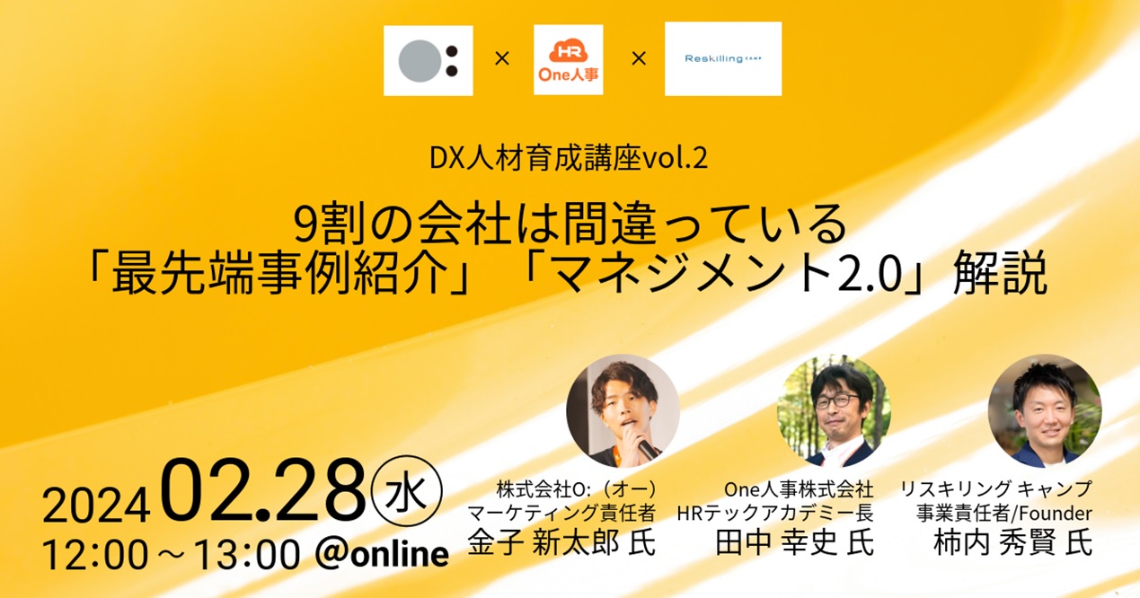 第2回目となる本セミナーではDX人材育成講座vol.2として、1on1ツール『Co:TEAM』を提供する株式会社O:(オー)から金子氏、人材プラットフォーム『One人事』を提供するOne人事株式会社から田中氏、リスキリング支援サービス『Reskilling Camp』柿内より、人材育成・タレントマネジメント・マネジメントの観点でDX人材育成のファーストステップについて解説します。