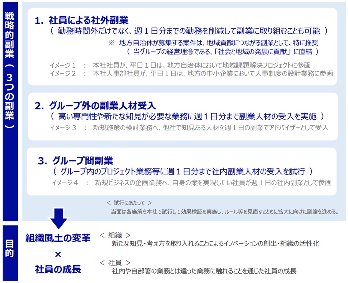 「戦略的副業」では、各社の本社において、①社員による社外副業、②グループ外の副業人材受入、③グループ間副業、の3つの副業を同時に試行開始しています。それぞれの副業の対象は、プロジェクト的に課題解決に取り組む業務です。本試行により当該業務に各々のキャリア(職業上の経験、ビジネススキル等)を活かすとともに、今後のキャリア形成につなげてまいります。