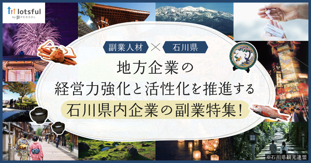 「はたらいて、笑おう。」をビジョンに掲げるパーソルグループのパーソルイノベーション株式会社 lotsful Company(本社:東京都港区、lotsful Company代表:田中 みどり)が運営する副業人材マッチングサービス『lotsful(ロッツフル)』( https://lotsful.jp/ )は、石川県人材確保・定住推進機構と連携し、石川県内の中小企業を支援する副業人材の募集を、本日より開始することをお知らせします。
