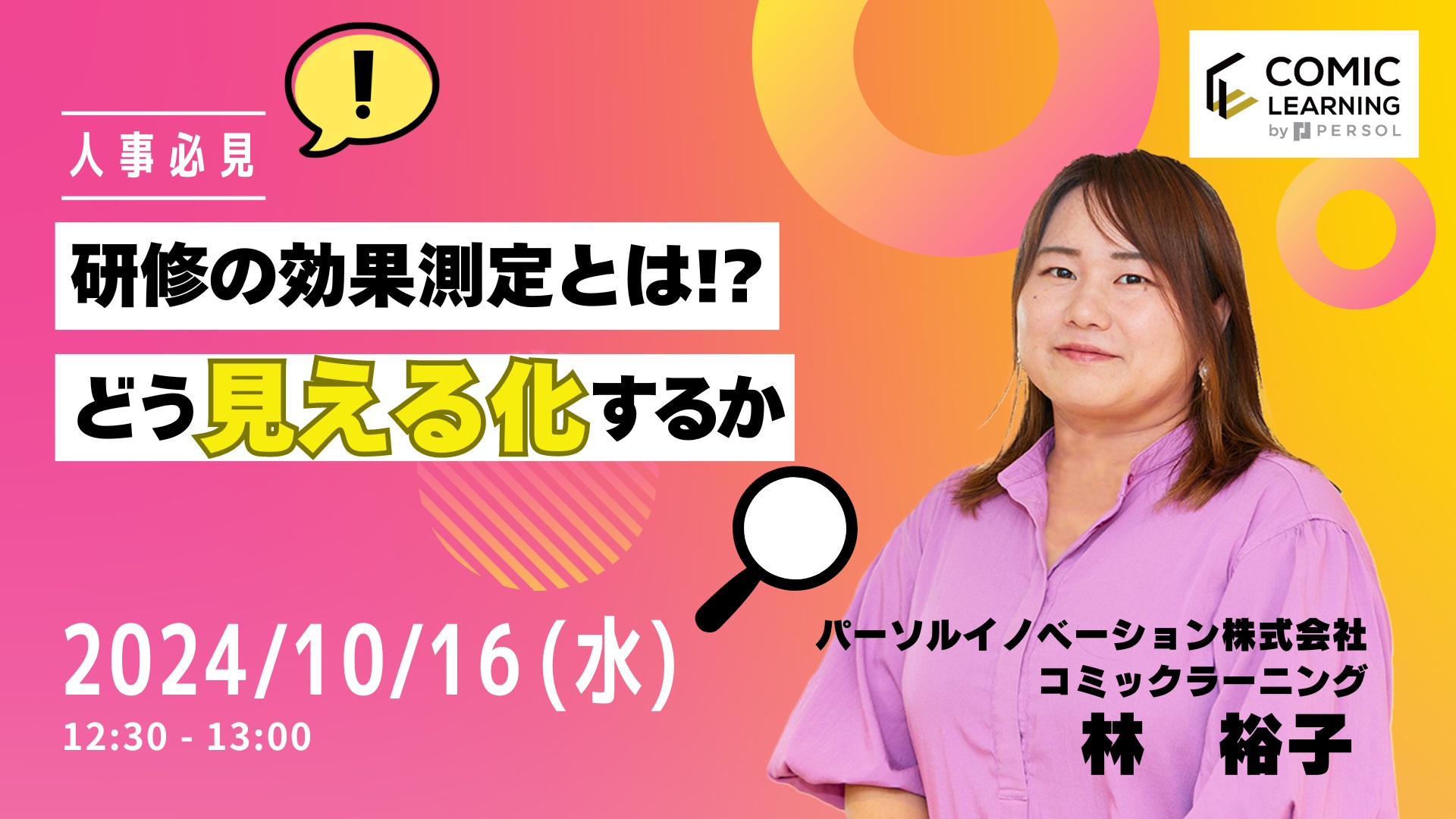 「はたらいて、笑おう。」をビジョンに掲げるパーソルグループのパーソルイノベーション株式会社 Comic Learning Company(本社:東京都港区、Comic Learning Company 代表:仙波 敦子)が展開するコミック教材を活用した研修サービス『コミックラーニング』は、“人事必見!研修の効果測定とは!?どう「見える化」するか?”と題し、オンラインセミナーを2024年10月16日(水)12:30~13:00に開催します。お昼休みの時間を使って、短時間で気軽に学ぶことができます。